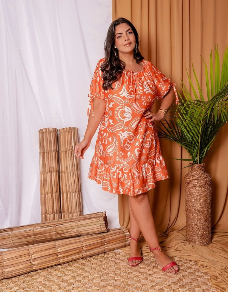 Um modelo que une estilo e conforto! Confeccionado em tecido leve, esse vestido laranja vibrante com detalhes de flores brancas traz frescor e alegria ao visual. A manga bufante valoriza os ombros e dá um toque romântico, enquanto o caimento garante movimento e elegância.